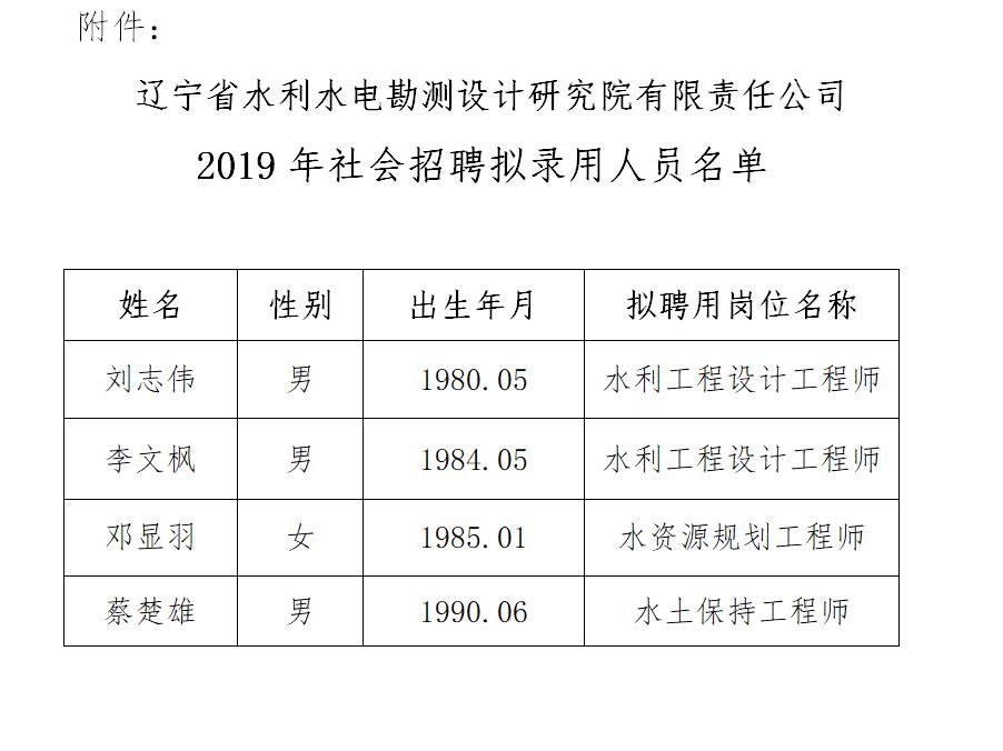 附件:辽宁省水利水电勘测设计研究院有限责任公司2019年社会招聘拟录用人员名单